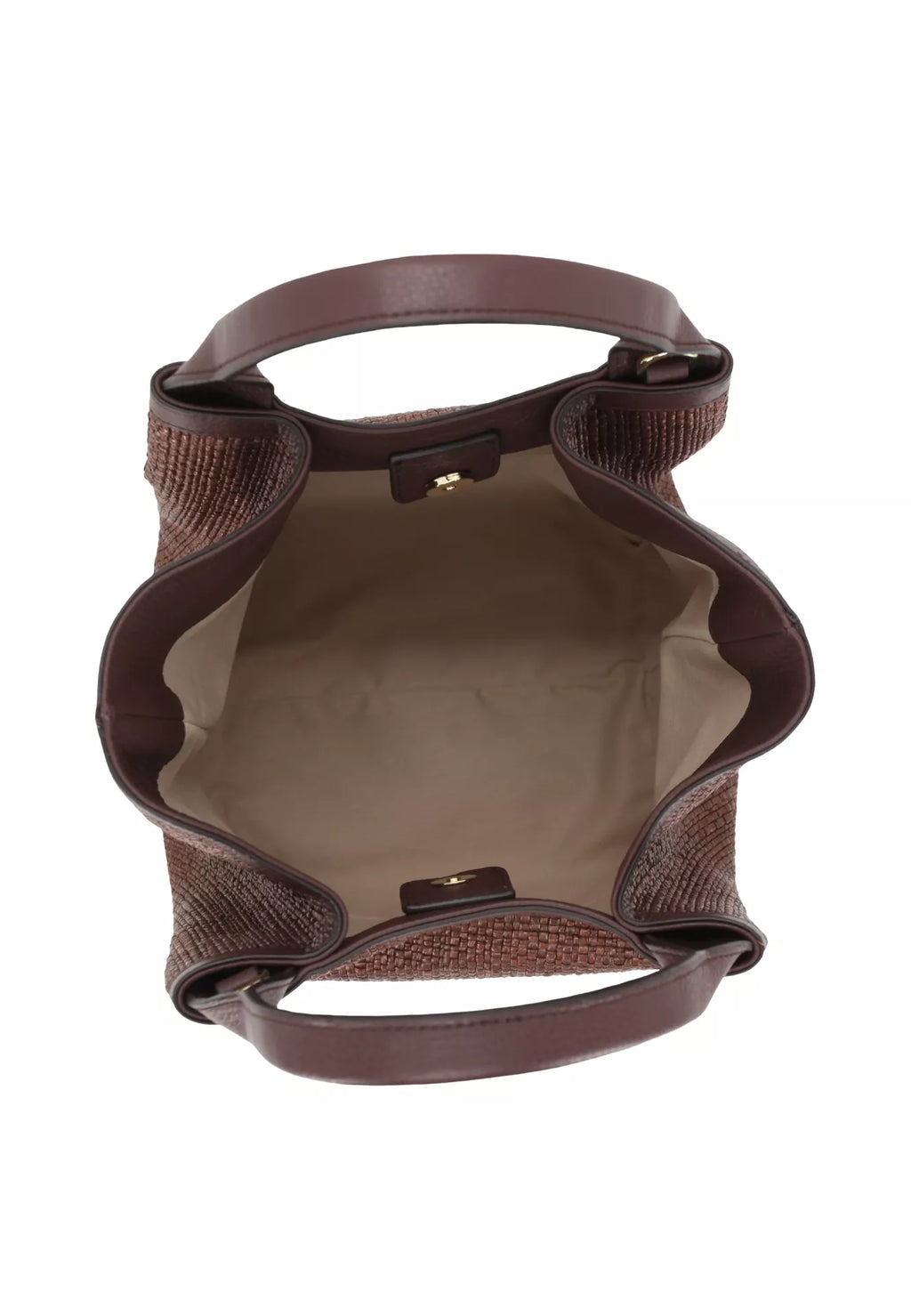 Ce sac combine un aspect raphia tressé et du cuir de vachette italien. Il dispose d’un compartiment principal sécurisé par une fermeture magnétique et de trois compartiments intérieurs, dont un avec fermeture éclair. Une bandoulière supplémentaire en cuir amovible et réglable en longueur est également incluse.