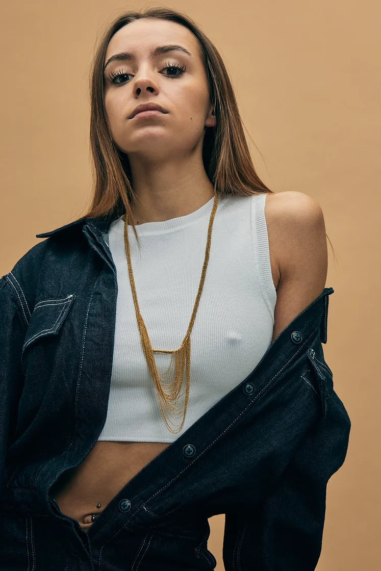 Adorable collier tissé main en or 18 carats paré de fines chaines en acier inoxydable et Lin